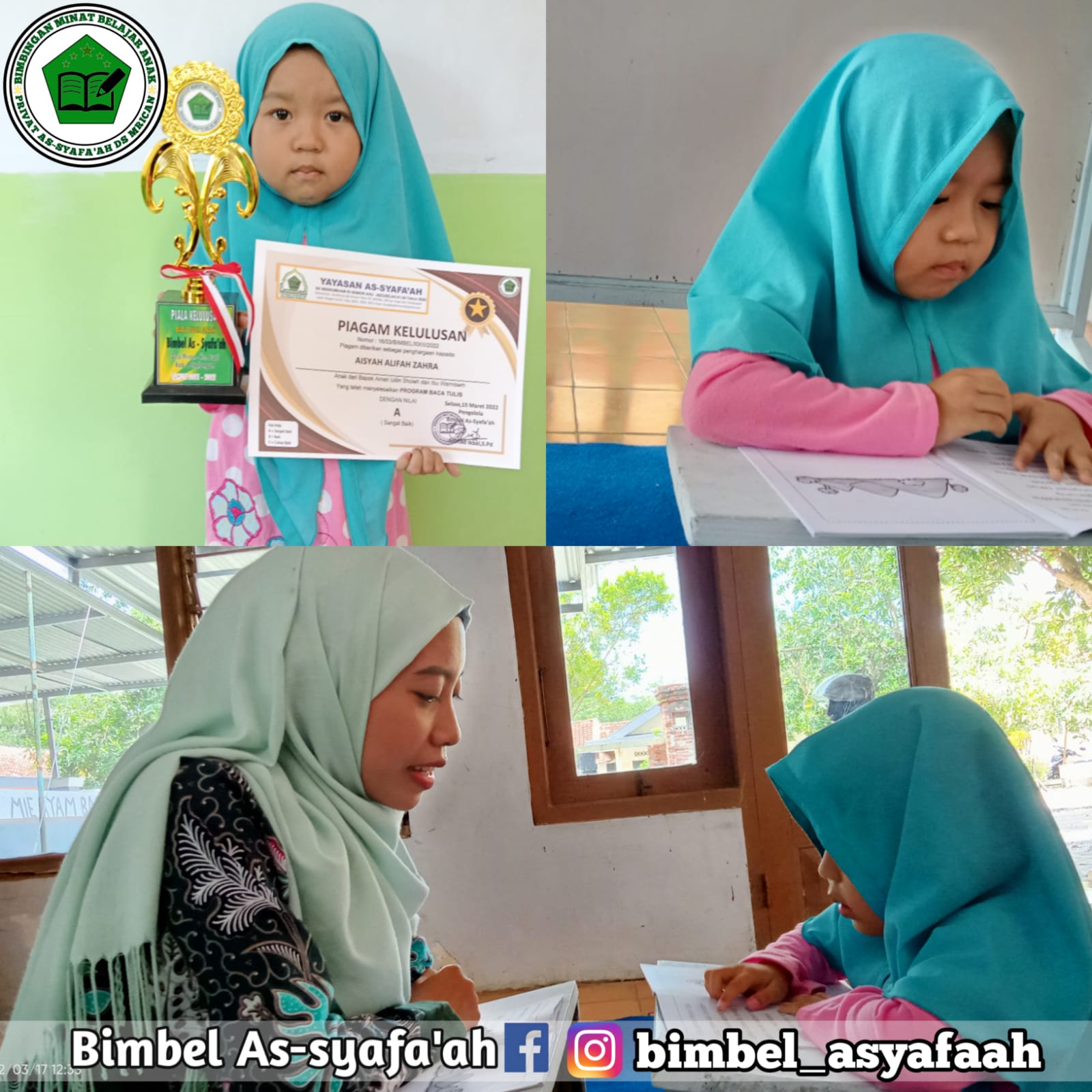 Selamat untuk anak didik Bimbel As Syafa'ah, Ananda Aisyah Alifah Zahra (5 tahun), yang telah menyelesaikan program ujian Baca-Tulis. Pertahankan prestasi dan semoga bermanfaat.